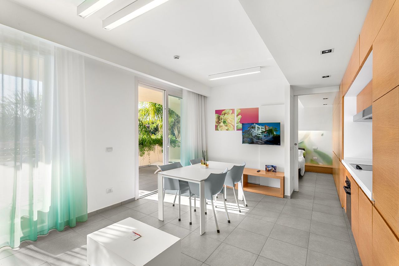 TWO-BEDROOM SUITE: the perfect solution for a family holiday or a stay with a group of friends, offering a spacious and comfortable environment for up to 5 guests. With its 50 square meters, this suite welcomes you into a bright and airy setting. You can relax in the large living area, equipped with a kitchen.