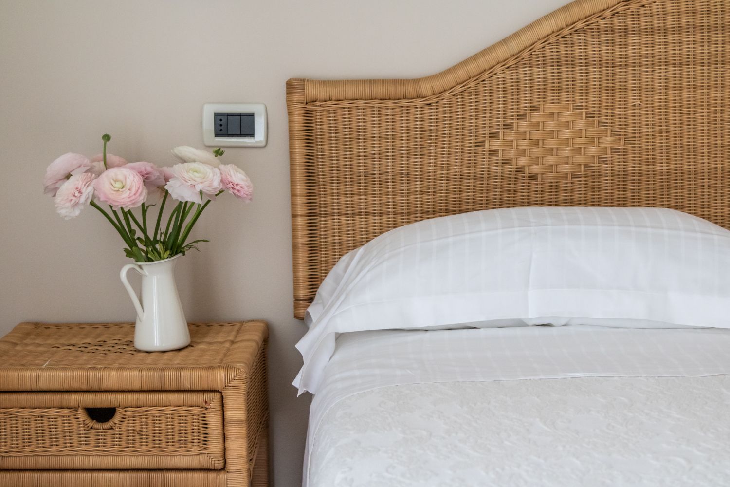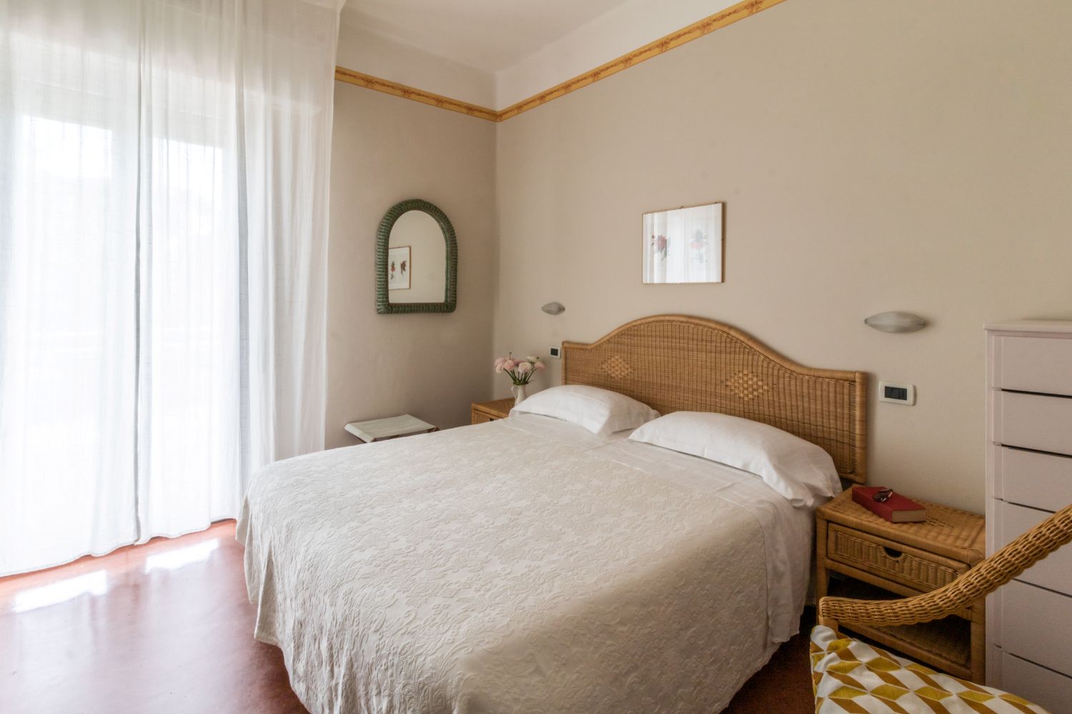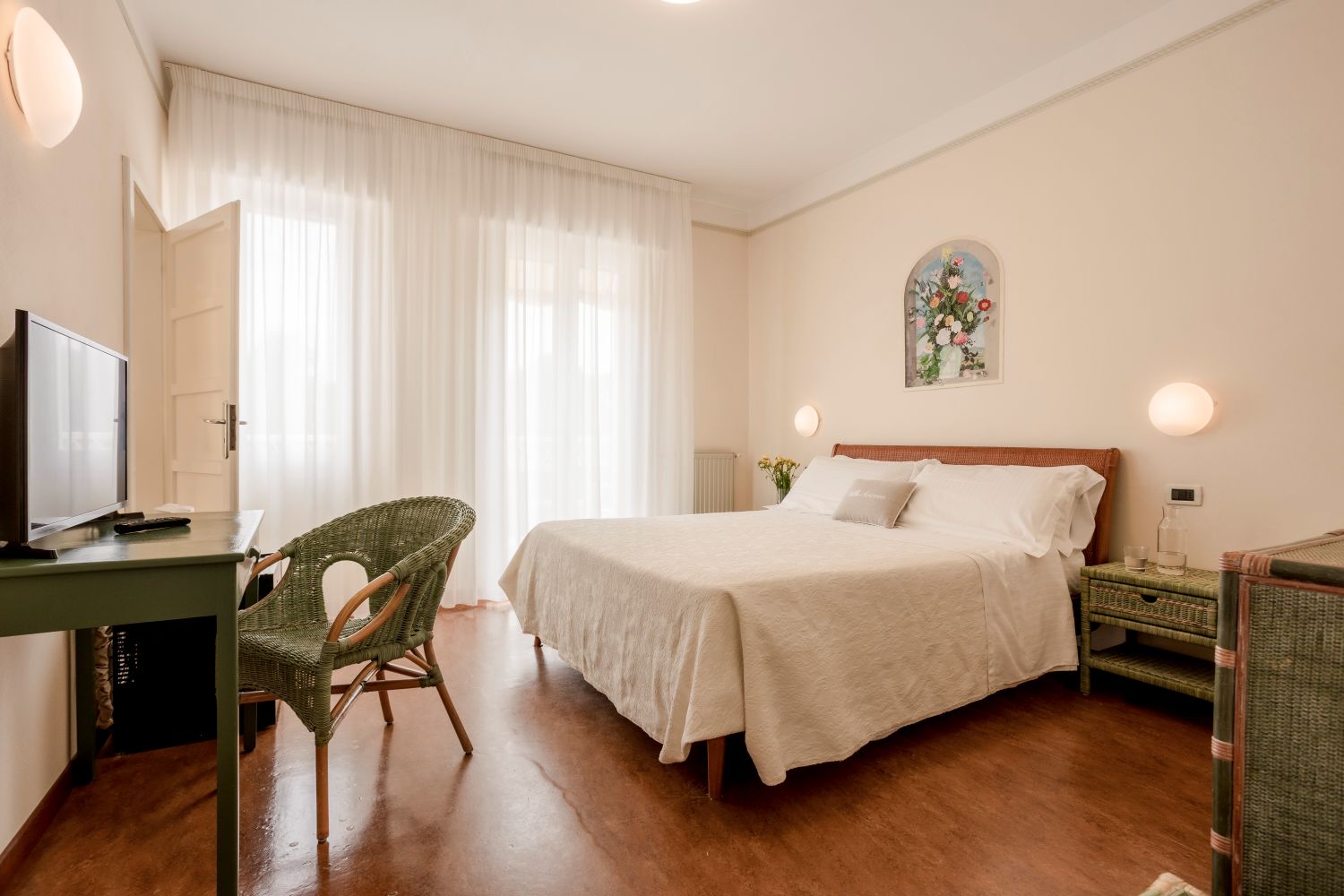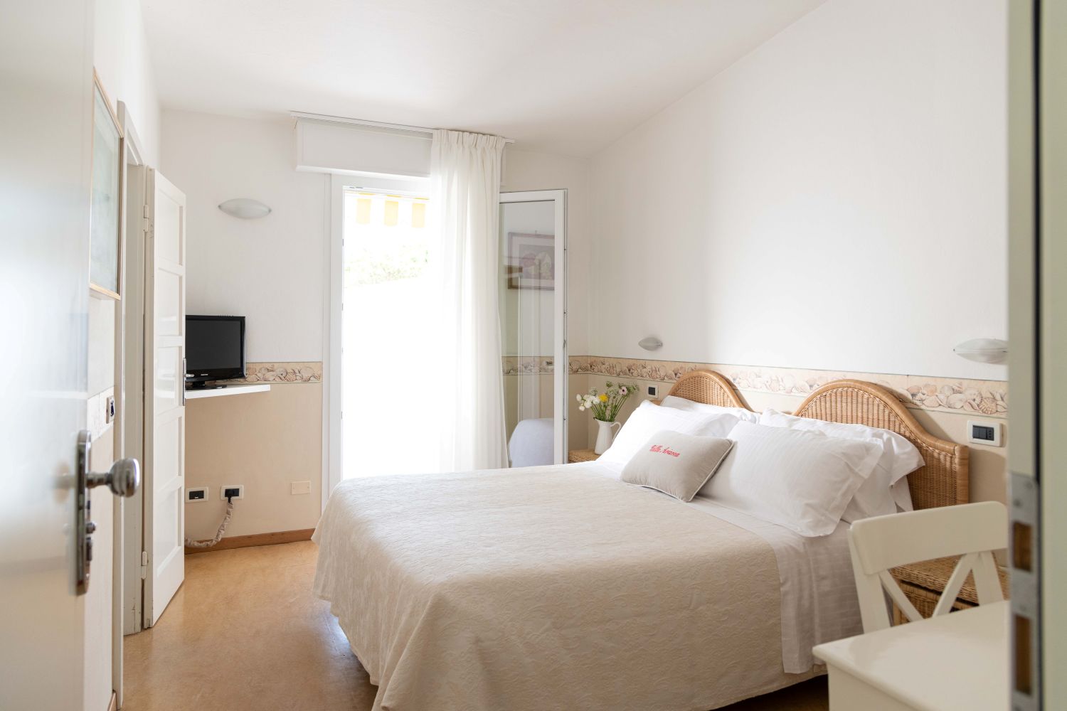 Double Rooms with Balcony: The double rooms are elegant and comfortable, with balconies where wisteria and jasmine create a romantic atmosphere. Perfect for a couple, they are ideal for relaxing after a day at the beach, enjoying the fragrance of flowers coming through the window.