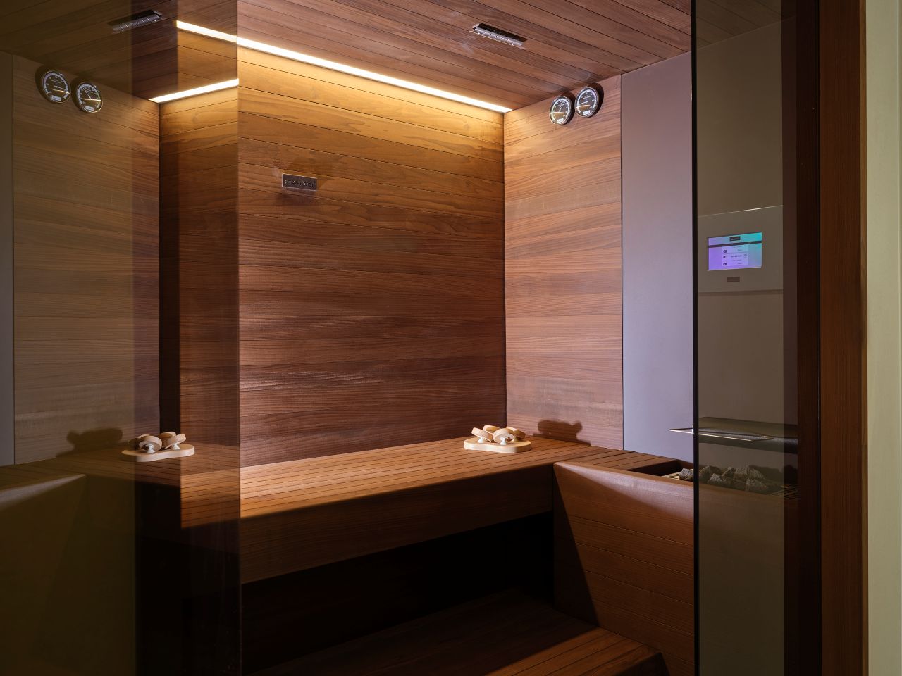 Completa la funzionalità della suite un bagno dotato di sauna, bagno turco, doccia multifunzionale e vasca idromassaggio.