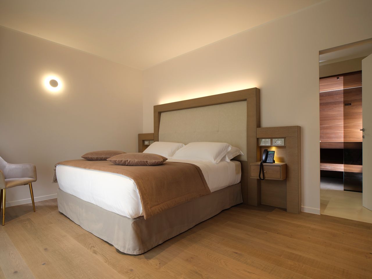 Superior Suite: in una fusione di legno, mattoni e pietra rosa di Assisi questa suite di lusso conserva il fascino del luogo, calda ed elegante, rigorosa ed accogliente con nuance di colore antichi che donano personalità all’ampia camera matrimoniale con vista sulla città che dialoga con la bellezza dell’intima zona dotata di vasca idromassaggio.