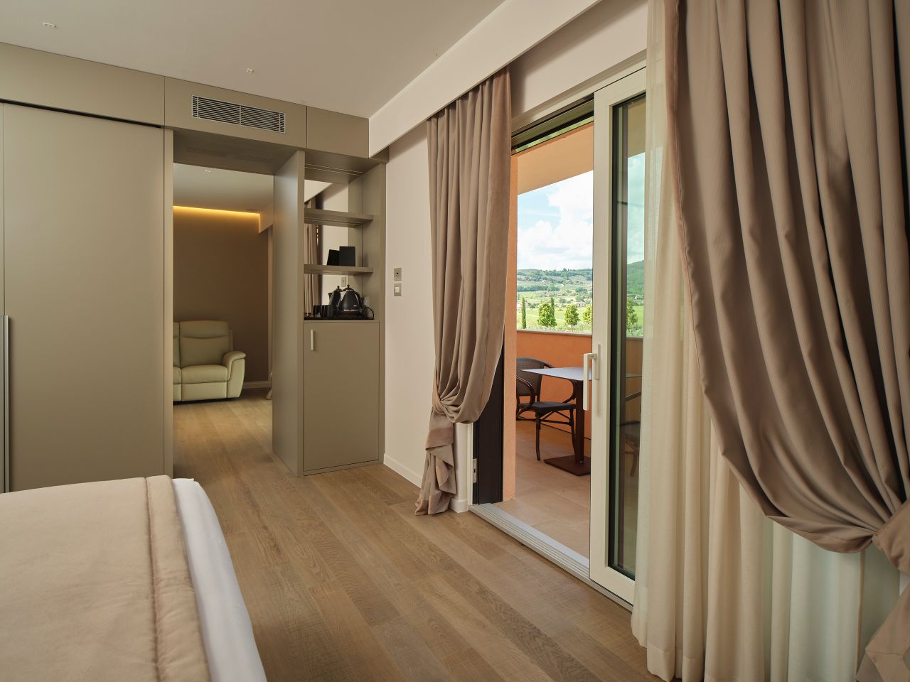 Suite: luminose ed eleganti, dal design moderno e funzionale, le suite accolgono ospiti in un confortevole living open space di semplice eleganza, che si apre su un’ampia vetrata e terrazza con vista su Assisi, perfetta per rilassarsi e per ammirare la rara bellezza della città medioevale.