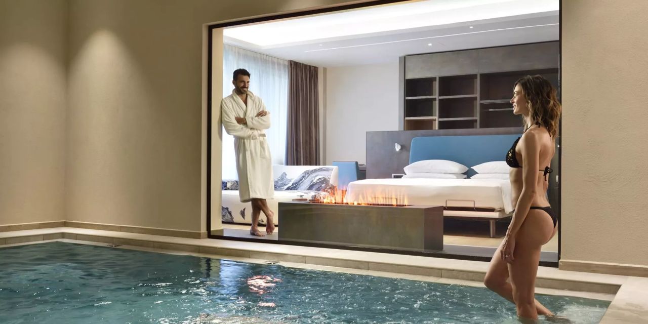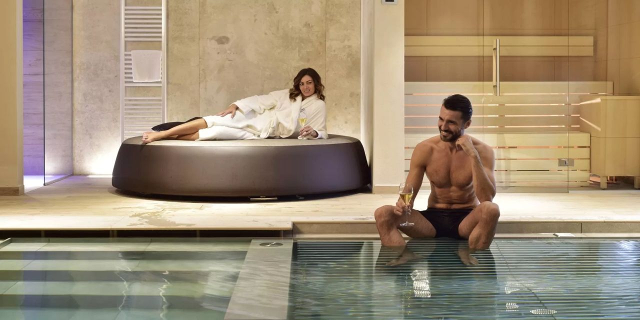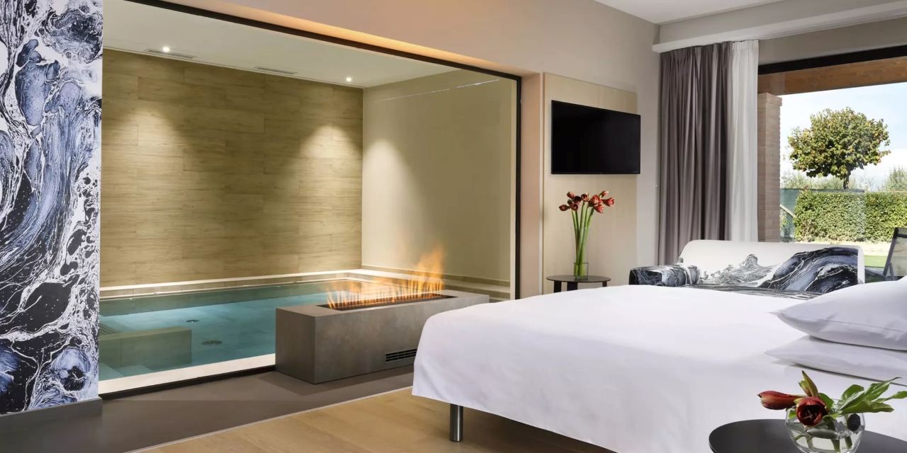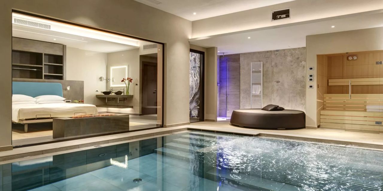 Luxury Love Suite: 130 mq, composta da open space con camino, soggiorno, camera da letto, bagno con doppio lavabo, grande divano, piscina interna privata con idromassaggio, sauna finlandese privata ed ampia vetrata su giardino e patio esterno. Ulteriori preziosi comfort sono lettini solarium, Smart Hospitality TV, specchio riscaldato con sound system, macchinetta per caffè e tè, minibar, aria condizionata e riscaldamento, cassaforte e connessione Wi-Fi.