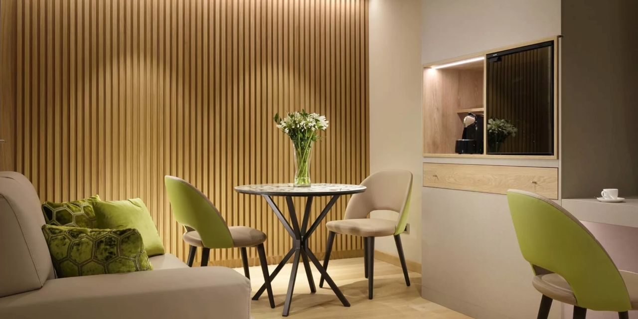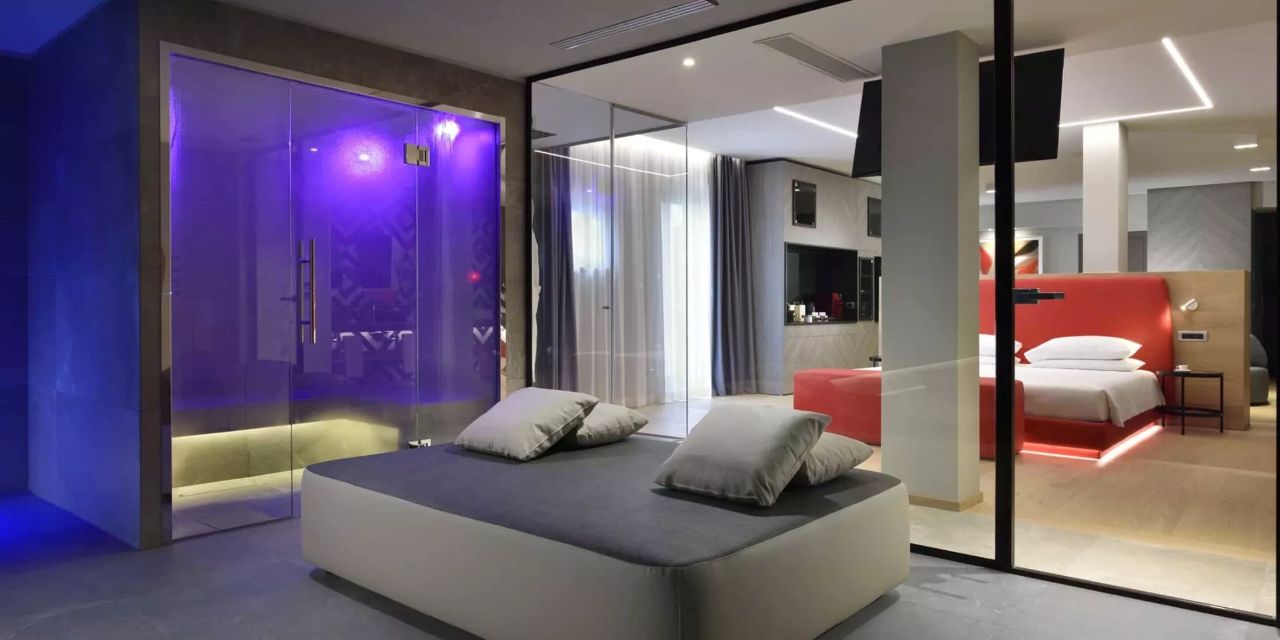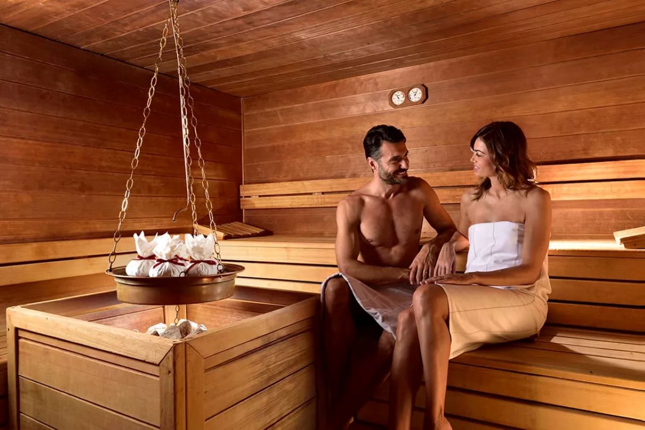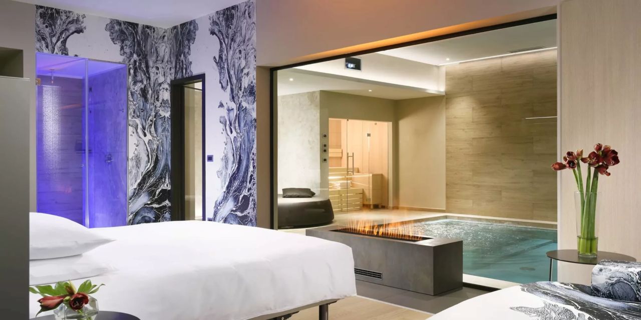Luxury Love Suite: 130 mq, composta da open space con camino, soggiorno, camera da letto, bagno con doppio lavabo, grande divano, piscina interna privata con idromassaggio, sauna finlandese privata ed ampia vetrata su giardino e patio esterno. Ulteriori preziosi comfort sono lettini solarium, Smart Hospitality TV, specchio riscaldato con sound system, macchinetta per caffè e tè, minibar, aria condizionata e riscaldamento, cassaforte e connessione Wi-Fi.