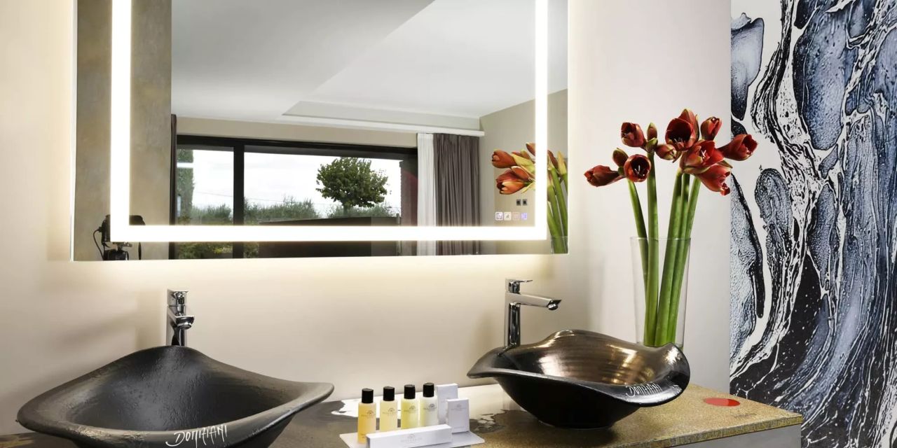 Charme Suite: 55 mq, composte da camera matrimoniale con vasca idromassaggio rotonda di coppia, bagno open space, TV, ampia doccia, doppio lavabo.