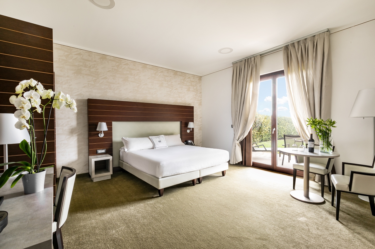 Grand Deluxe: le nostre eleganti Grand Deluxe offrono un ambiente confortevole e luminoso perfetto per un soggiorno di benessere in pieno relax. Alcune camere godono inoltre di una vista imperdibile grazie al balcone affacciato sui colli in cui è immerso il resort.