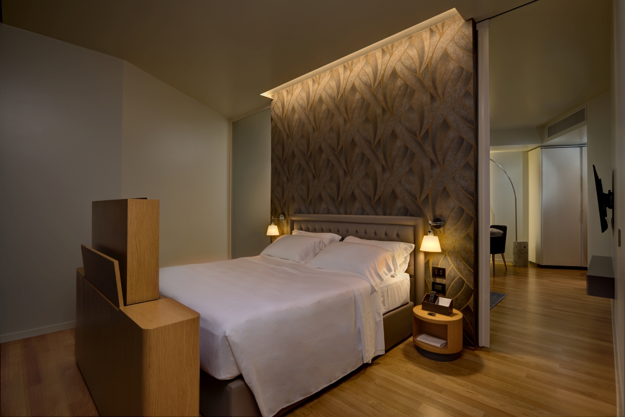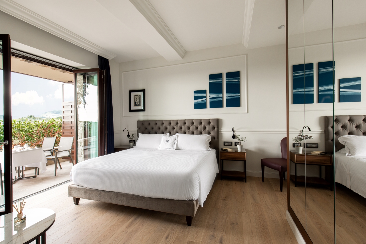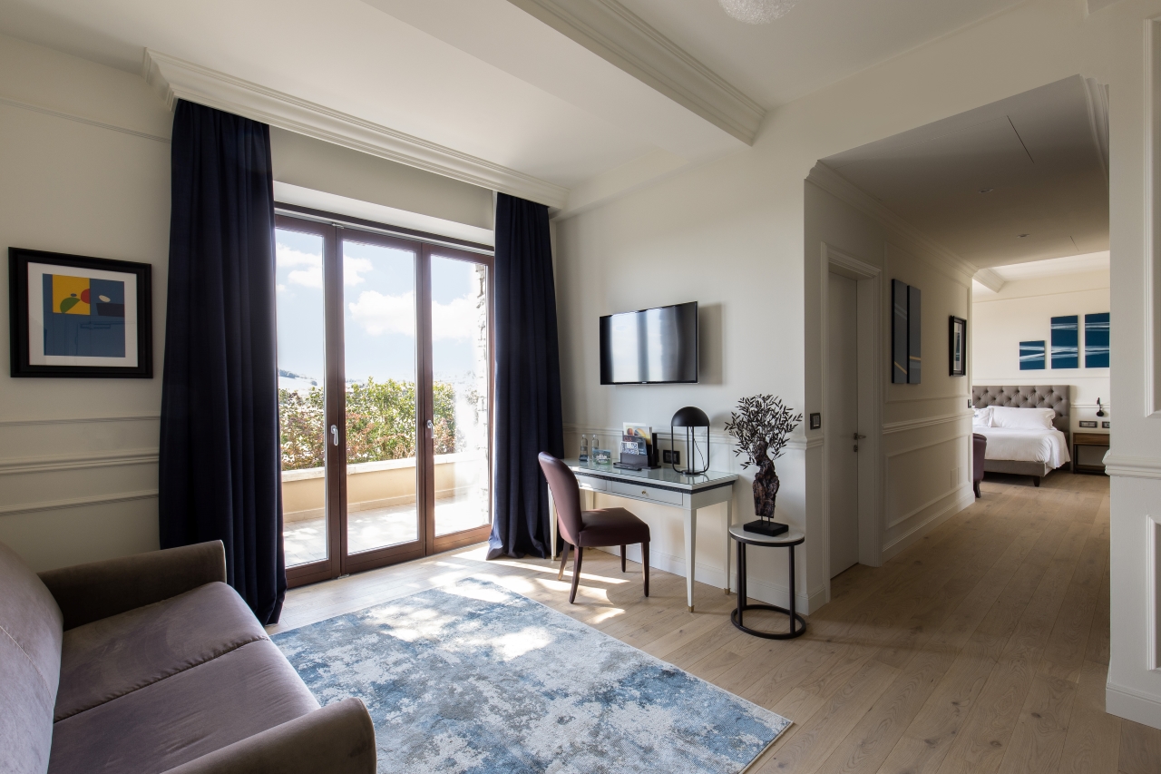 Deluxe Executive: camere di categoria superiore dallo stile classico contemporaneo arredate con ricchezza di dettagli e materiali preziosi: dalle ecopelli capitonnè alle testate dei letti, ai velluti che rivestono sommier e poltrone fino alle applique in oro chiaro alle pareti. L'utilizzo di materiali naturali come il legno di rovere del parquet e la scelta di nuances calde e rilassanti per pareti e arredi offrono all'ospite un ambiente accogliente, in continuum ideale tra spazi interni ed esterni, anche grazie alle grandi vetrate che incorniciano il paesaggio su cui affaccia l'ampia terrazza di oltre 10 mq.