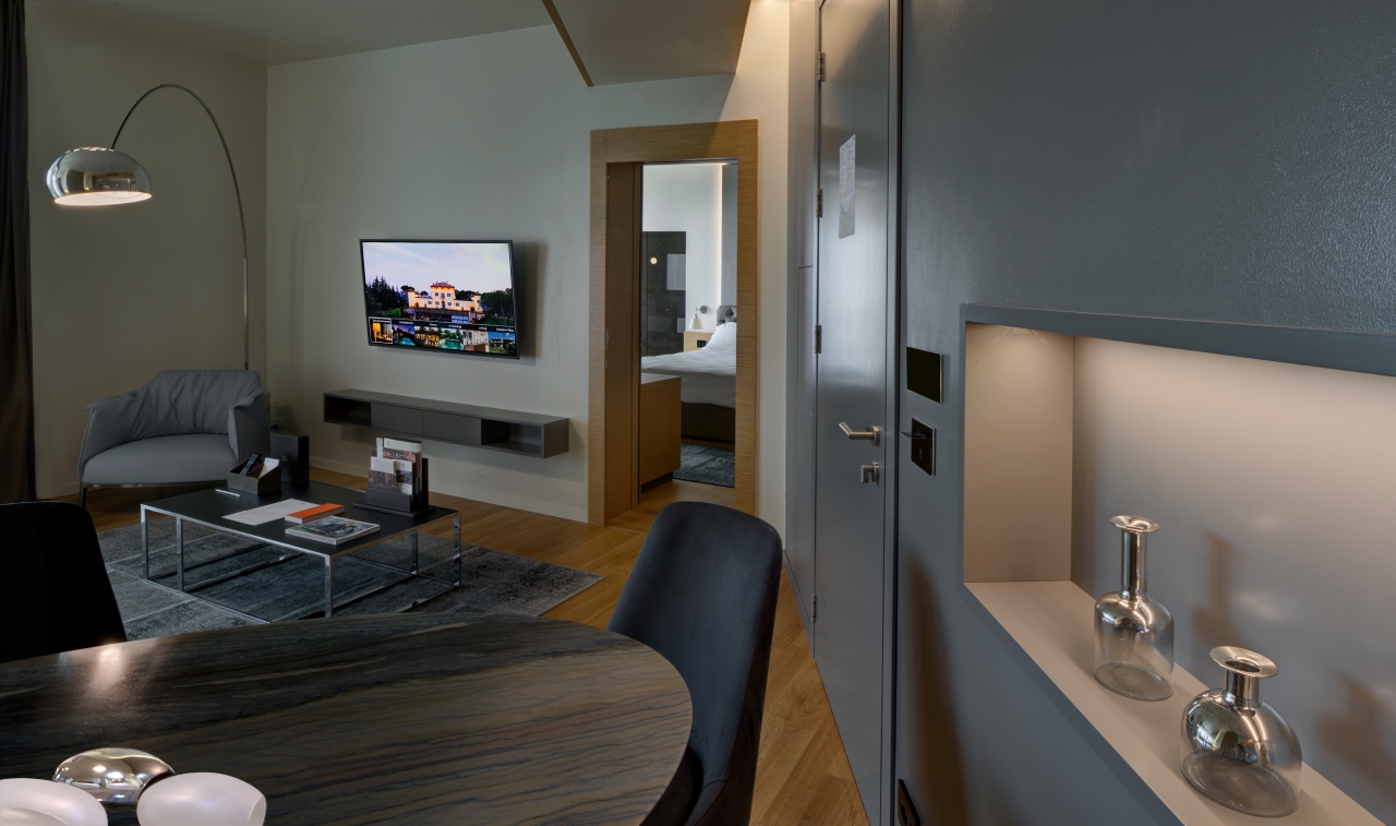 One Bedroom Suite: i toni naturali degli interni si fondono con il paesaggio su cui si affacciano le vaste vetrate, impreziosendo la Suite. L'ampia area living rende la Suite un luogo ideale anche per momenti conviviali di famiglia o per ritagliarsi attimi di puro lusso.