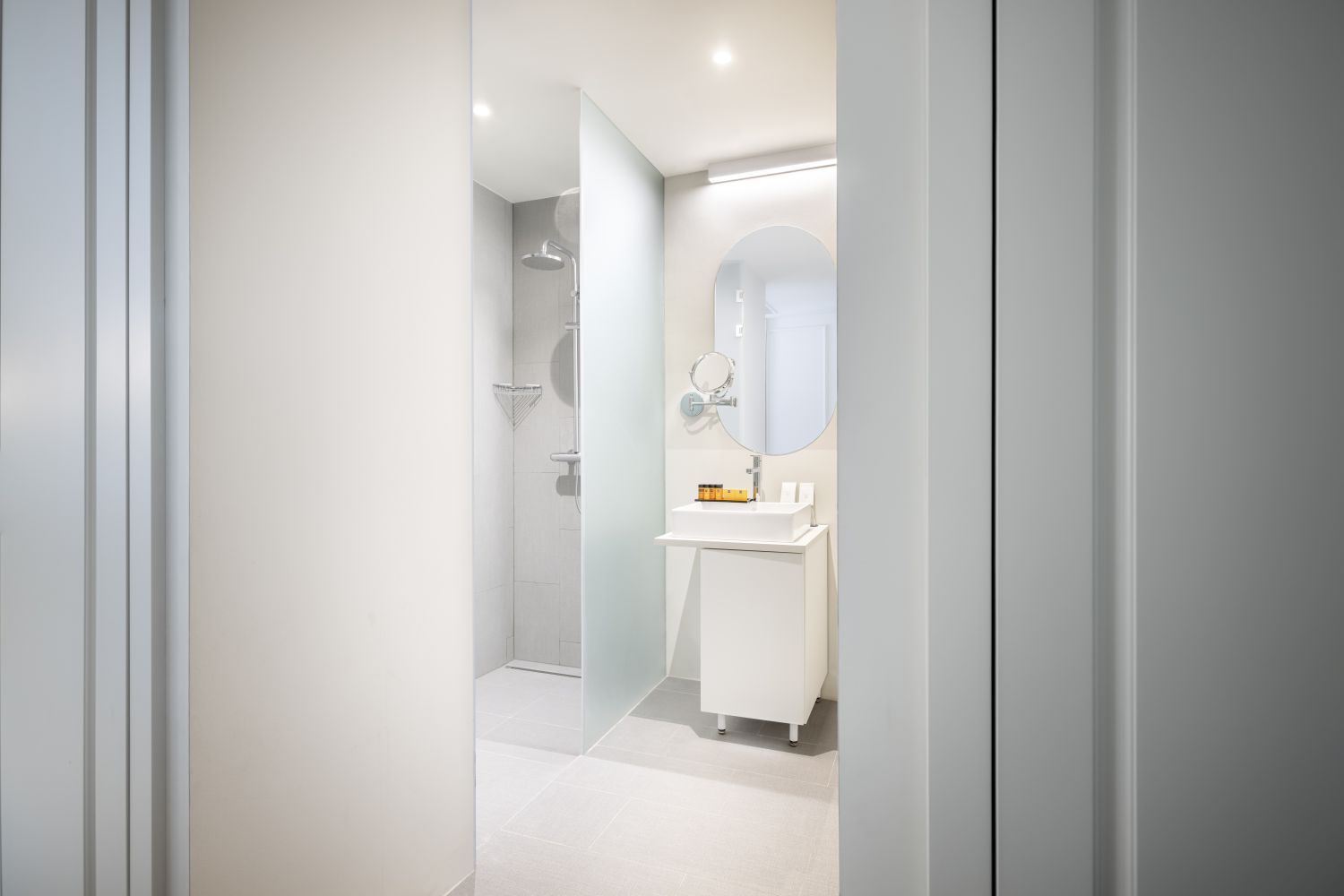 Standard-Familienzimmer: zwei Schlafzimmer – eines mit einem Doppelbett, das andere mit zwei Einzelbetten, Badezimmer mit Dusche.