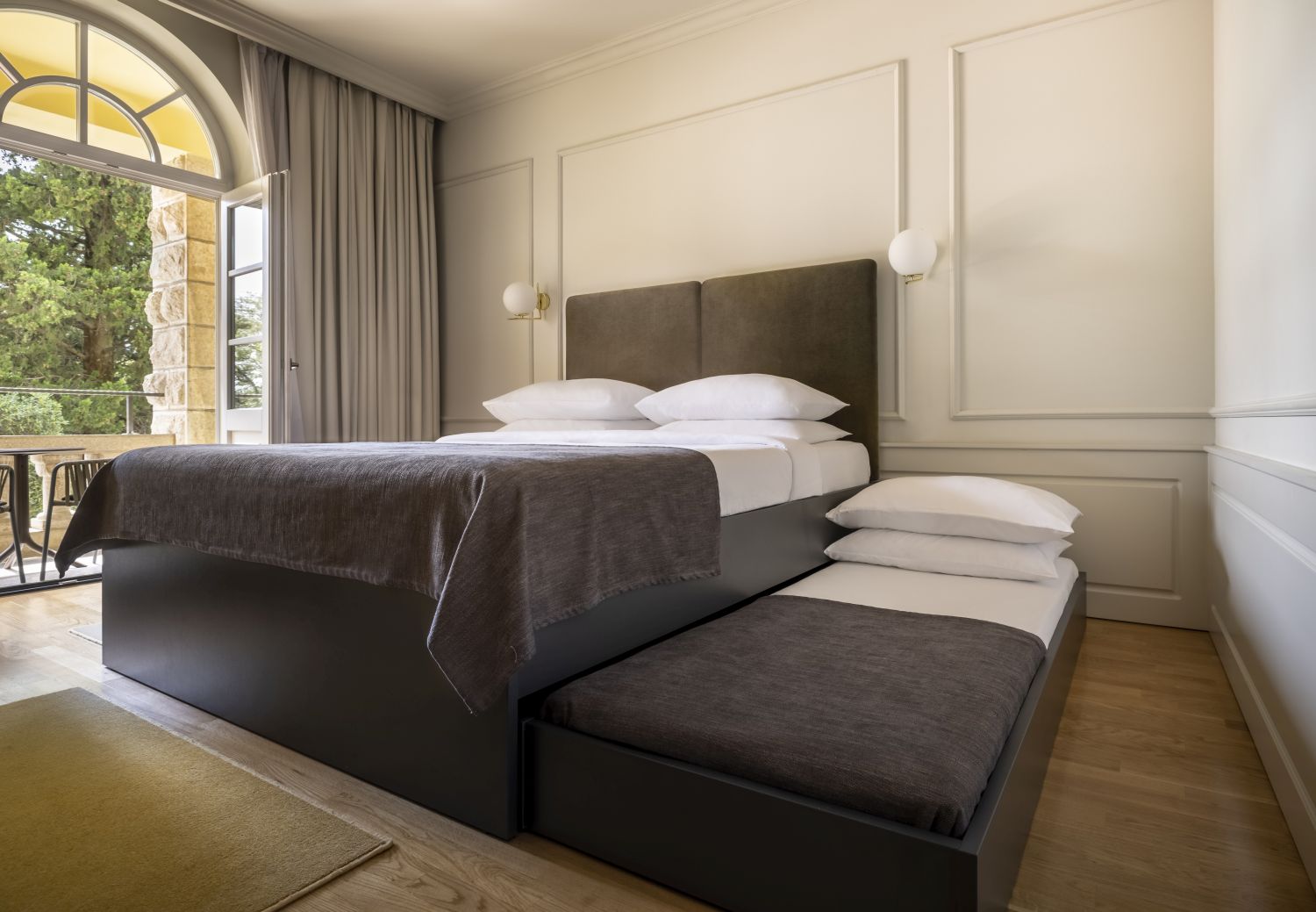 Classic verbundene Familienzimmer mit Balkon: Zwei Doppelzimmer, die durch eine Tür verbunden sind. Jedes Zimmer verfügt über ein Doppelbett und ein ausziehbares Zustellbett sowie ein Badezimmer mit Dusche.