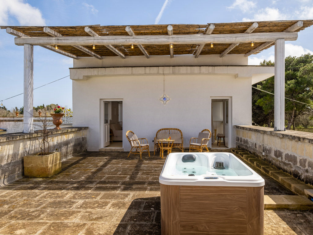 Suite Terrace: Average surface of 50 m², accommodates up to 4 guests. The large living area, equipped with a sofa bed, leads to the master bedroom, where there is a romantic four-poster bed in handmade wood. The bathroom, with sink in Lecce stone, has a large shower cabin. Outside, for the exclusive use of guests, there is a large terrace overlooking the entire farm. Here guests can enjoy maximum relaxation in the shade of the canopy, between the deckchairs or in the private Jacuzzi.